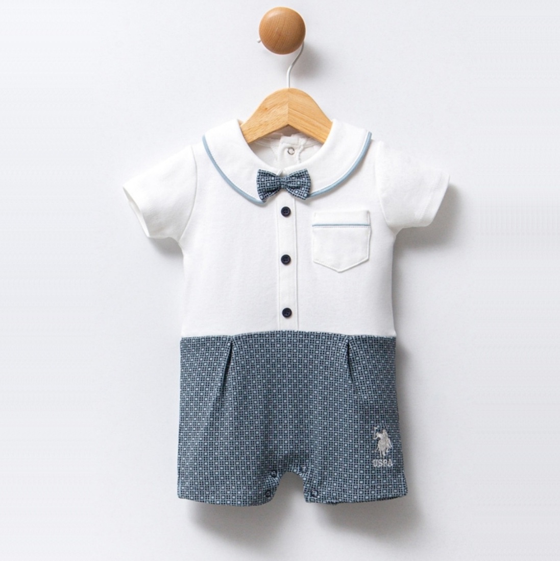 رامپر پسرانه سفید سرمهای US.POLO ASSN ترک، زیباترین انتخاب برای پرنس کوچک و مراسمهای خاص! این رامپر مجلسی با طراحی یقه نوزادی، پاپیون ثابت سرمهای، سه دکمه مشکی و جیب تزئینی، ظاهری کاملاً رسمی و آقازادهای به کوچولوی شما میدهد.