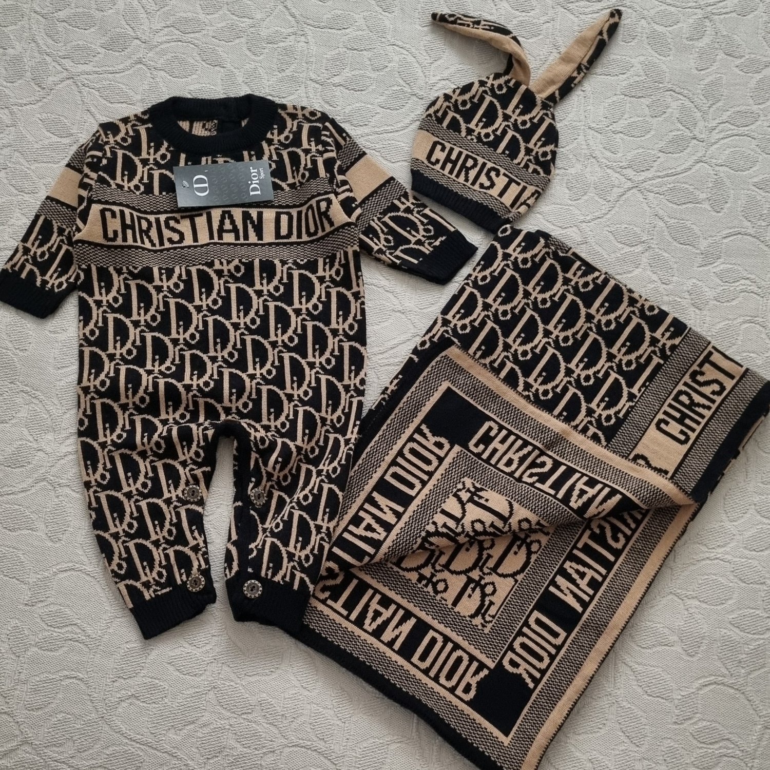 ست بافت نوزادی ۳ تیکه طرح دیور Dior مشکی شتری ترک – لاکچری و فوقالعاده ناز