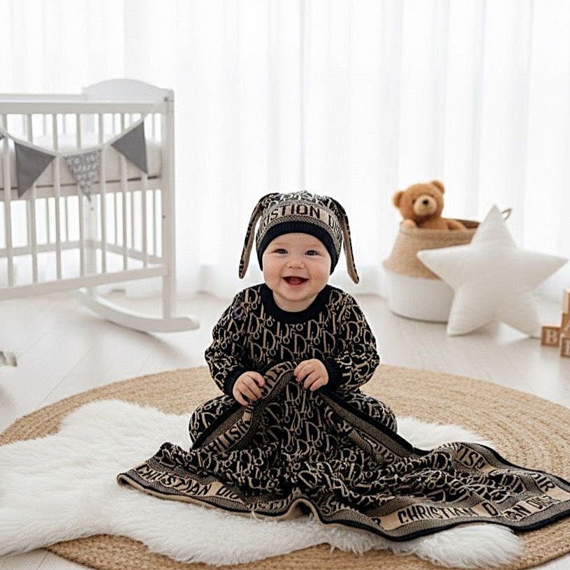 ست بافت نوزادی ۳ تیکه طرح دیور Dior مشکی شتری ترک، همان ست رویایی اینستاگرامی که همه مامانها عاشقش هستند! این مجموعه شامل سرهمی بافت آستینبلند + کلاه گوشخرگوشی + پتوی دورپیچ بزرگ با طرح مونوگرام Dior است که کوچولوی ۲ تا ۱۲ ماهه شما را شبیه یک عروسک لوکس فرانسوی میکند.