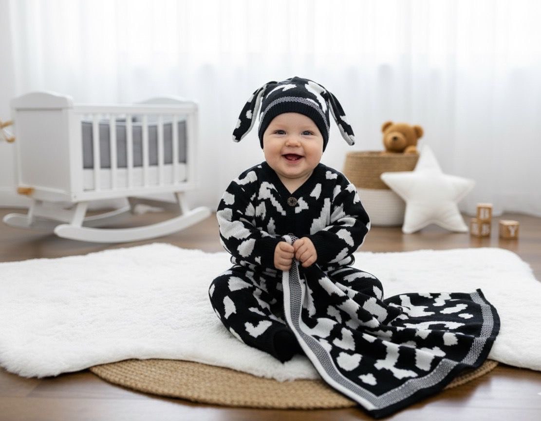 این ست با رنگهای و طرح تکراری “گاوی”، ظاهری مدرن و اسپرت دارد. سرهمی با دکمههای قهوهای در قسمت جلویی، پوشیدن و تعویض لباس را آسان کرده و یقه گرد با دوخت نرم، راحتی را برای نوزاد تضمین میکند. کلاه با طرح خرگوش و گوشهای بلند، نه تنها زیبا بلکه کاربردی است و سر نوزاد را گرم نگه میدارد. پتو با همان طرح هماهنگ، اندازهای مناسب برای پیچاندن نوزاد یا استفاده در کالسکه دارد. تصویر این ست روی سطح نرم با بافت ظریف، جلوهای گرم و دلنشین به آن بخشیده است. طراحی هماهنگ هر سه تکه، استایلی یکپارچه برای سیسمونی ایجاد میکند.