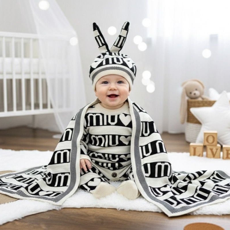 این ست با رنگهای شیری و مشکی و طرح راهراه با نوشته “miu میو” و قلبهای کوچک، ظاهری اسپرت و دوستداشتنی دارد. سرهمی با دکمههای قهوهای در قسمت جلویی، پوشیدن و تعویض لباس را آسان کرده و یقه گرد با دوخت نرم، راحتی را برای نوزاد تضمین میکند. کلاه با طرح خرگوش و گوشهای بلند، نه تنها زیبا بلکه کاربردی است و سر نوزاد را گرم نگه میدارد. پتو با همان طرح هماهنگ، اندازهای مناسب برای پیچاندن نوزاد یا استفاده در کالسکه دارد. تصویر این ست روی سطح نرم با بافت ظریف، جلوهای گرم و دلنشین به آن بخشیده است.