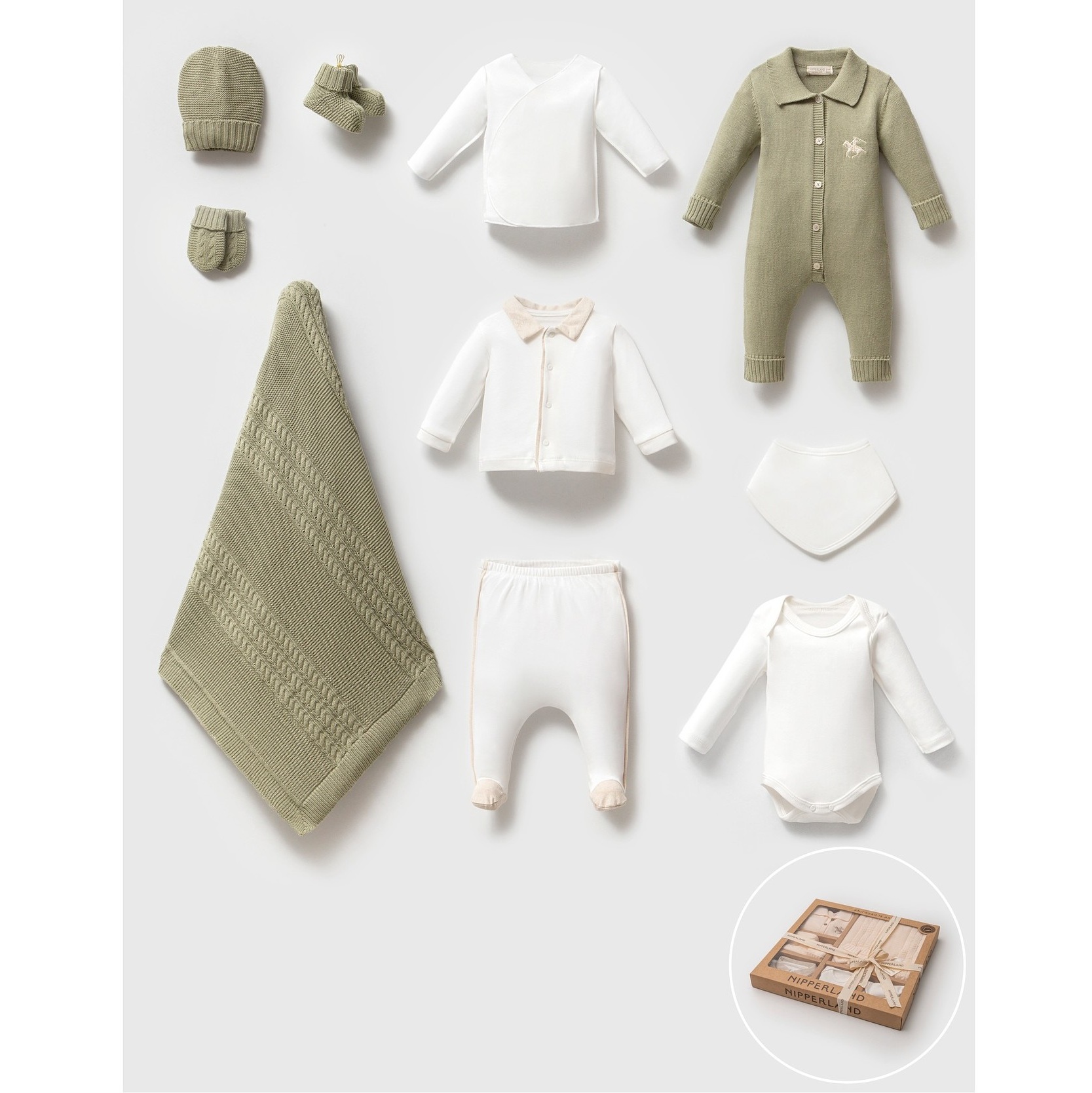 این سِت با کیفیت شامل بلوز و شلوار، سرهمی، زیرپوش بدون دکمه، دورپیچ، کلاه، دستکش، پیشبند و جوراب است و در جعبه اورجینال تحویل داده میشود.