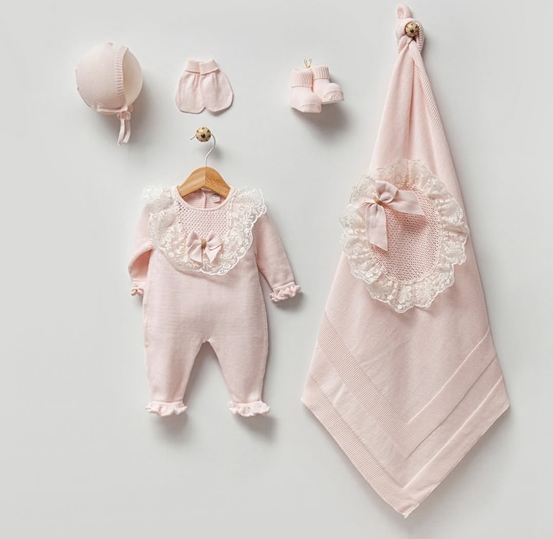ست بیمارستانی 5 تیکه بافت دخترانه تور و پاپیون نیپرلند جعبه دار | 0 تا 3 ماه