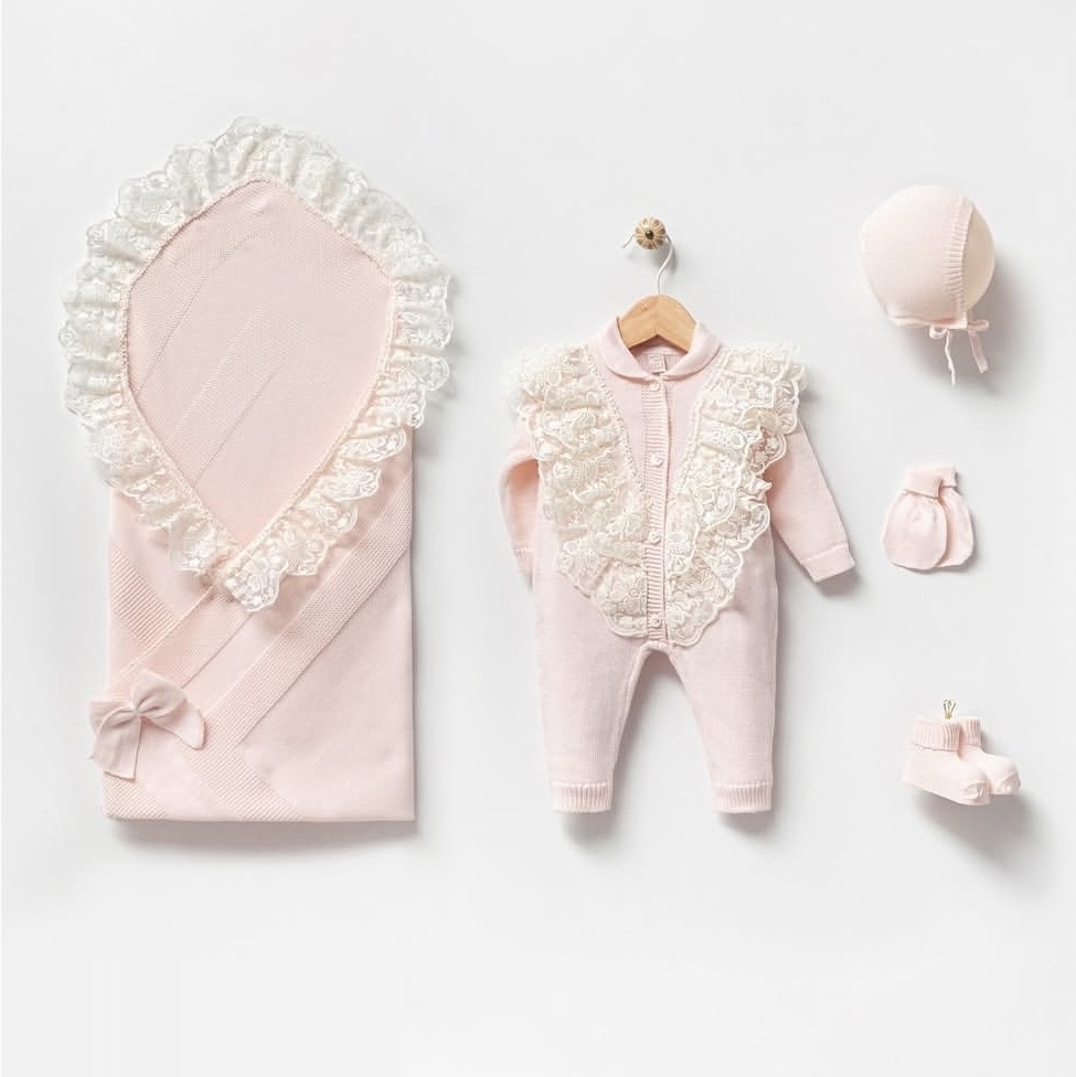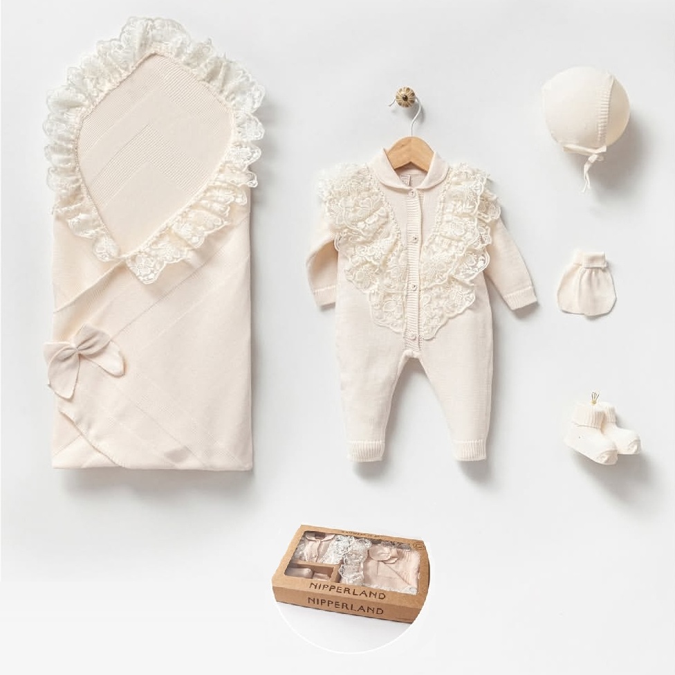 ست بیمارستانی 5 تیکه دخترانه بافت و تور نیپرلند ترک جعبه دار | 0 تا 3 ماه