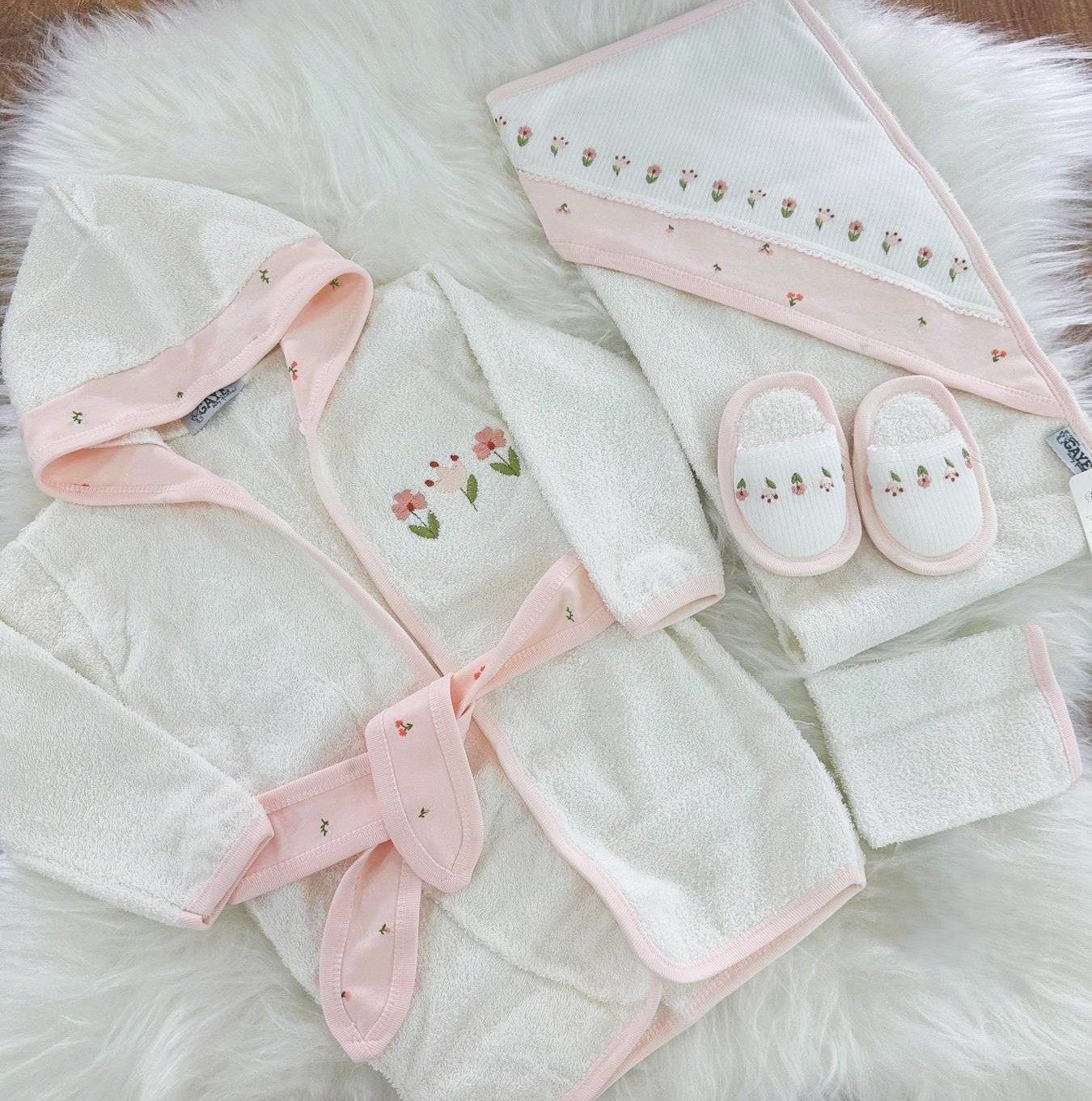 ست حوله نوزادی 4 تیکه دخترانه گلدار ترک جعبه دار | 0 تا 3 ماه