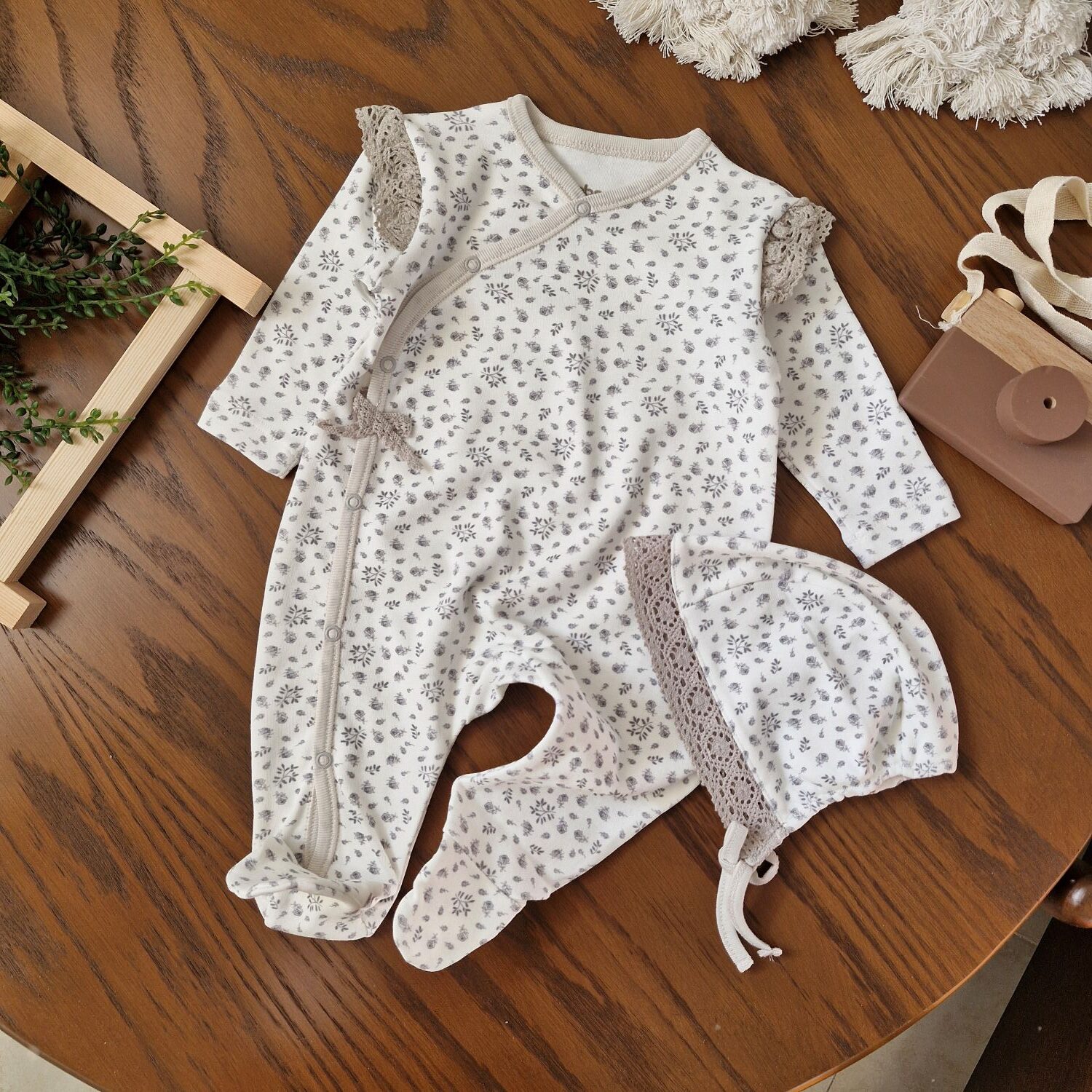 حراج – ست سرهمی و کلاه دخترانه طرح گل ریز طوسی ترک