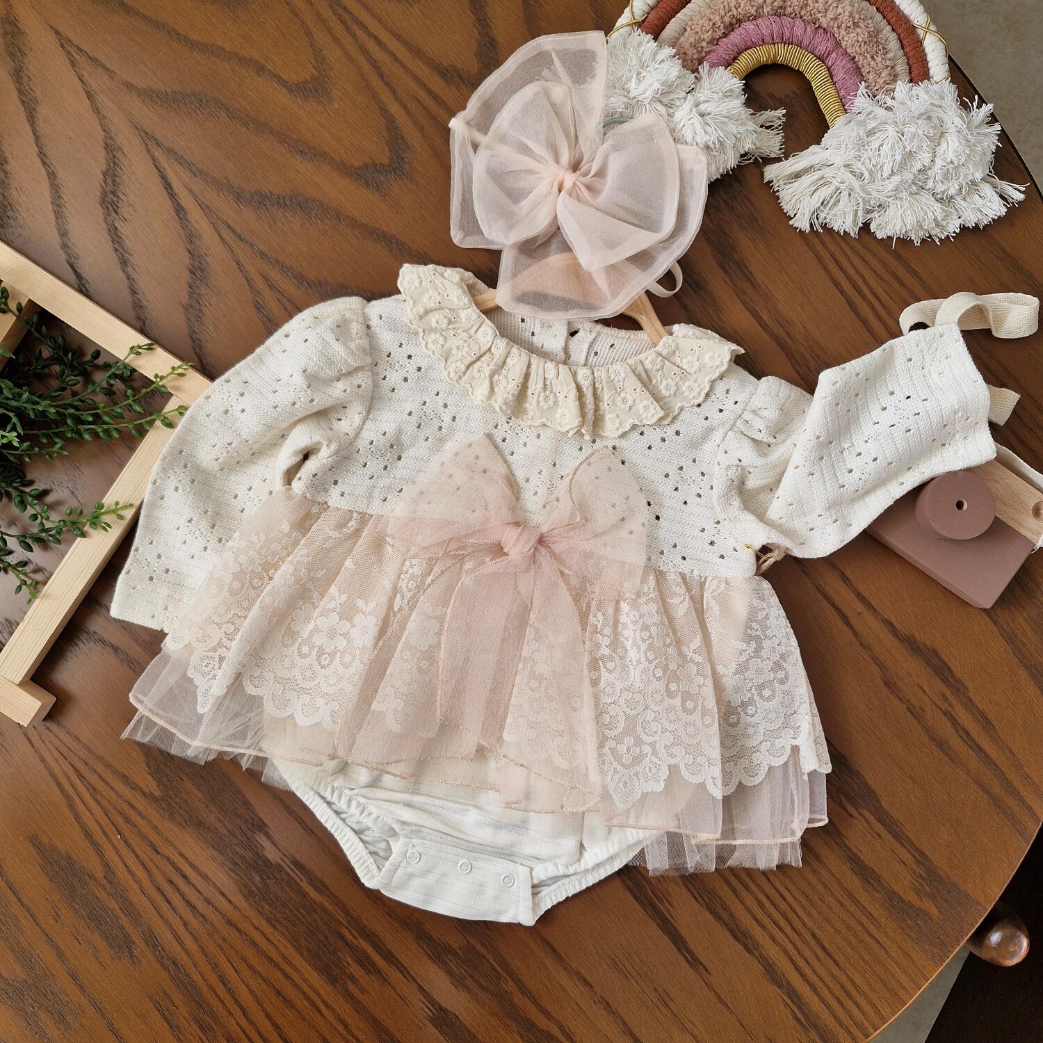 ست پیراهن بادی دامن گیپور و تل پاپیونی دخترانه ترک، زیباترین لباس مجلسی برای پرنسس ۳ تا ۱۸ ماهه شماست! این ست دوتکه فوقالعاده لاکچری با رنگ نباتی ملایم (کرم شیری گرم) و ترکیب گیپور خامهدوزیشده، دامن تور چندلایه و تل پاپیونی غول پیکر، دخترتان را شبیه عروسکهای فرانسوی میکند. هر جا بروید همه میپرسند «از کجا خریدی؟»